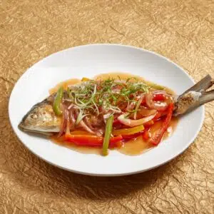 - To plate, arrange the vegetables around and on top of our fish and pour sauce over the finish. Serve on top of a mound of piping hot rice. Enjoy and share with friends and family!